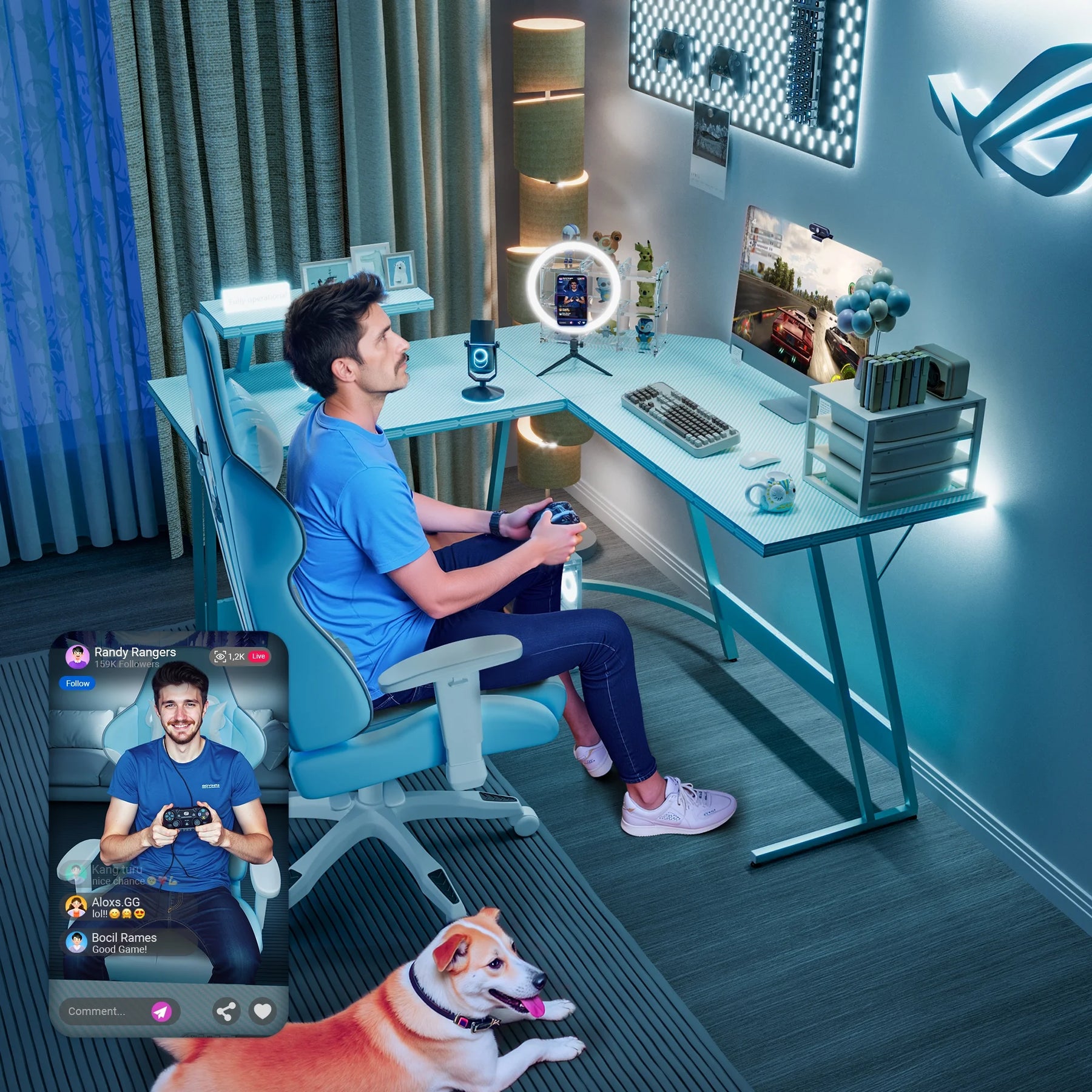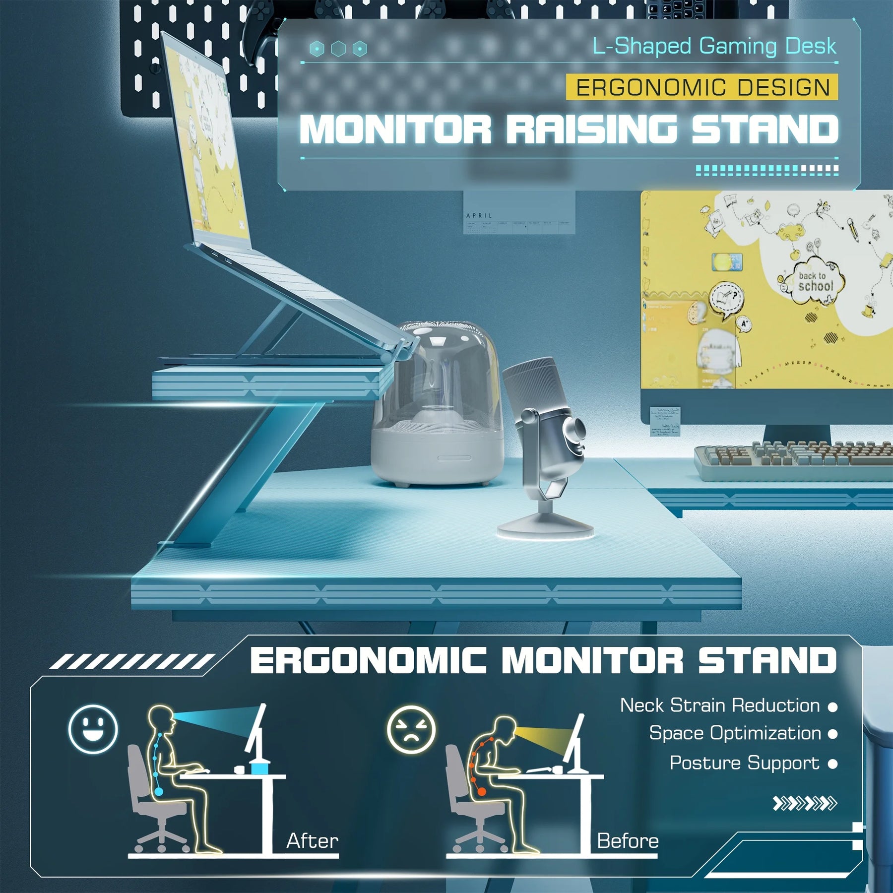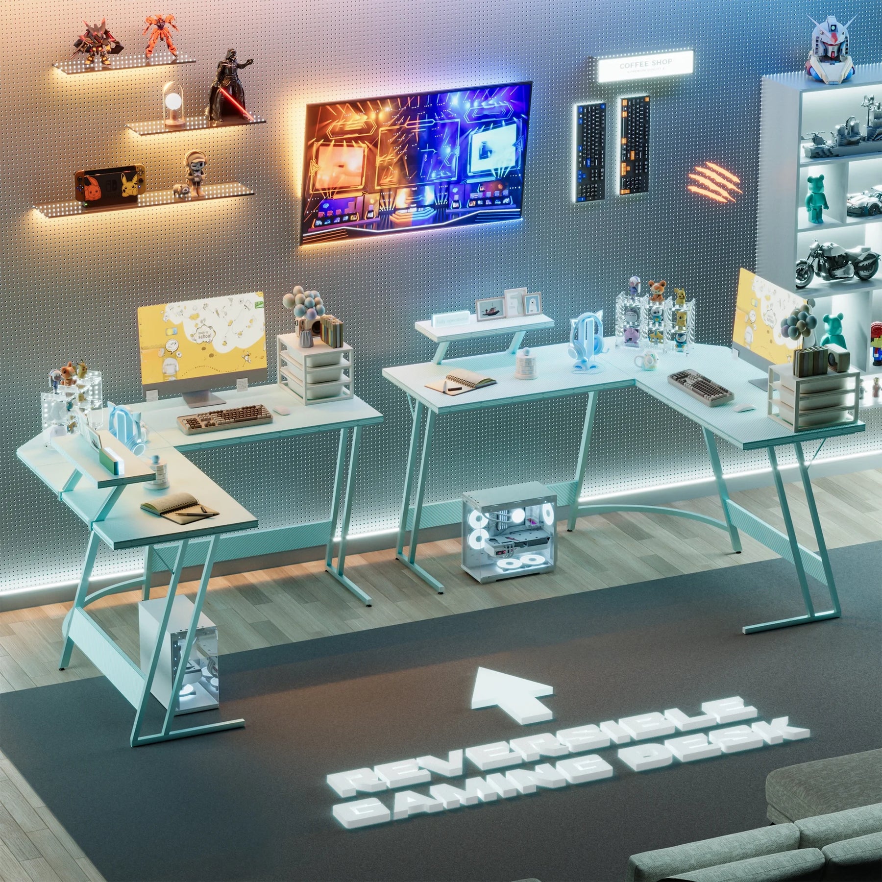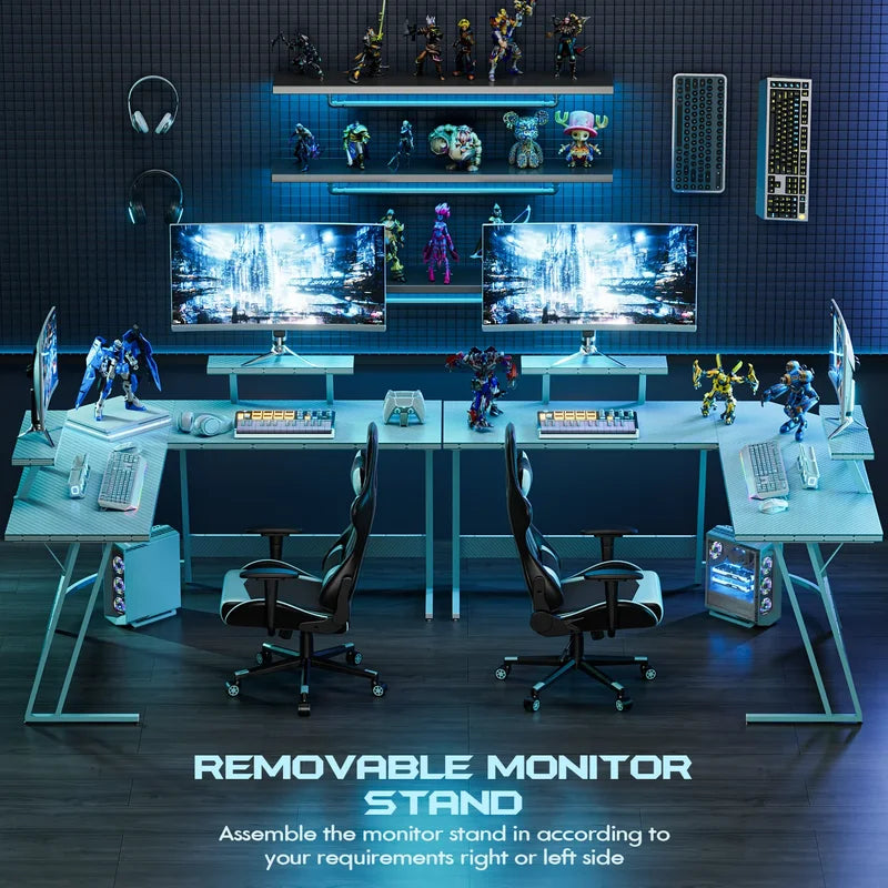 • Efficient Design: The L-shaped layout optimizes corner space, freeing up the central area of the room for a wider activity zone and providing ample storage options. The dual desktops facilitate seamless transitions during work or gaming sessions.