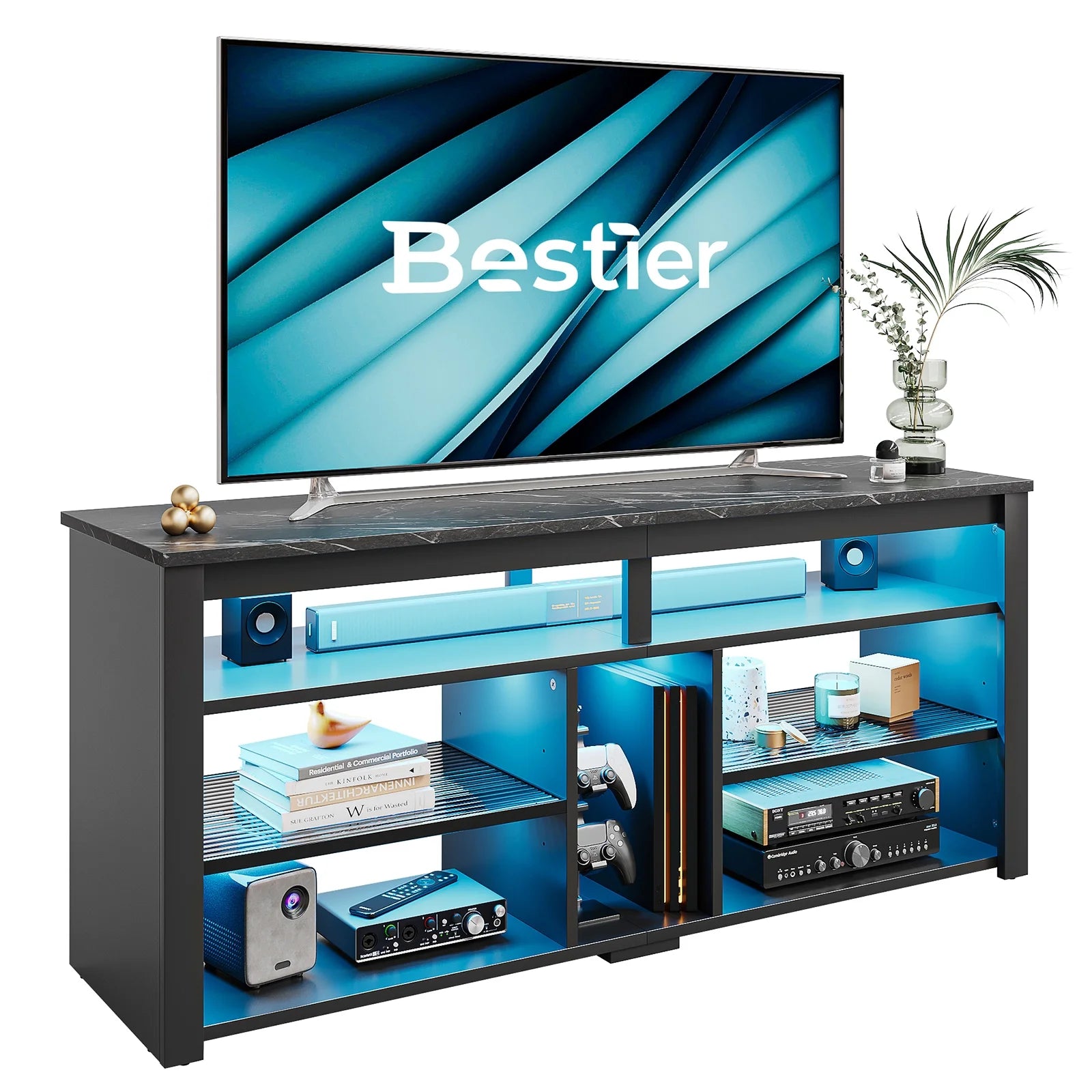 Bestier LED Tall TV Stand for TVs up to 65", Entertainment Center with Storage, TV Console for Bedroom, Black Marble.