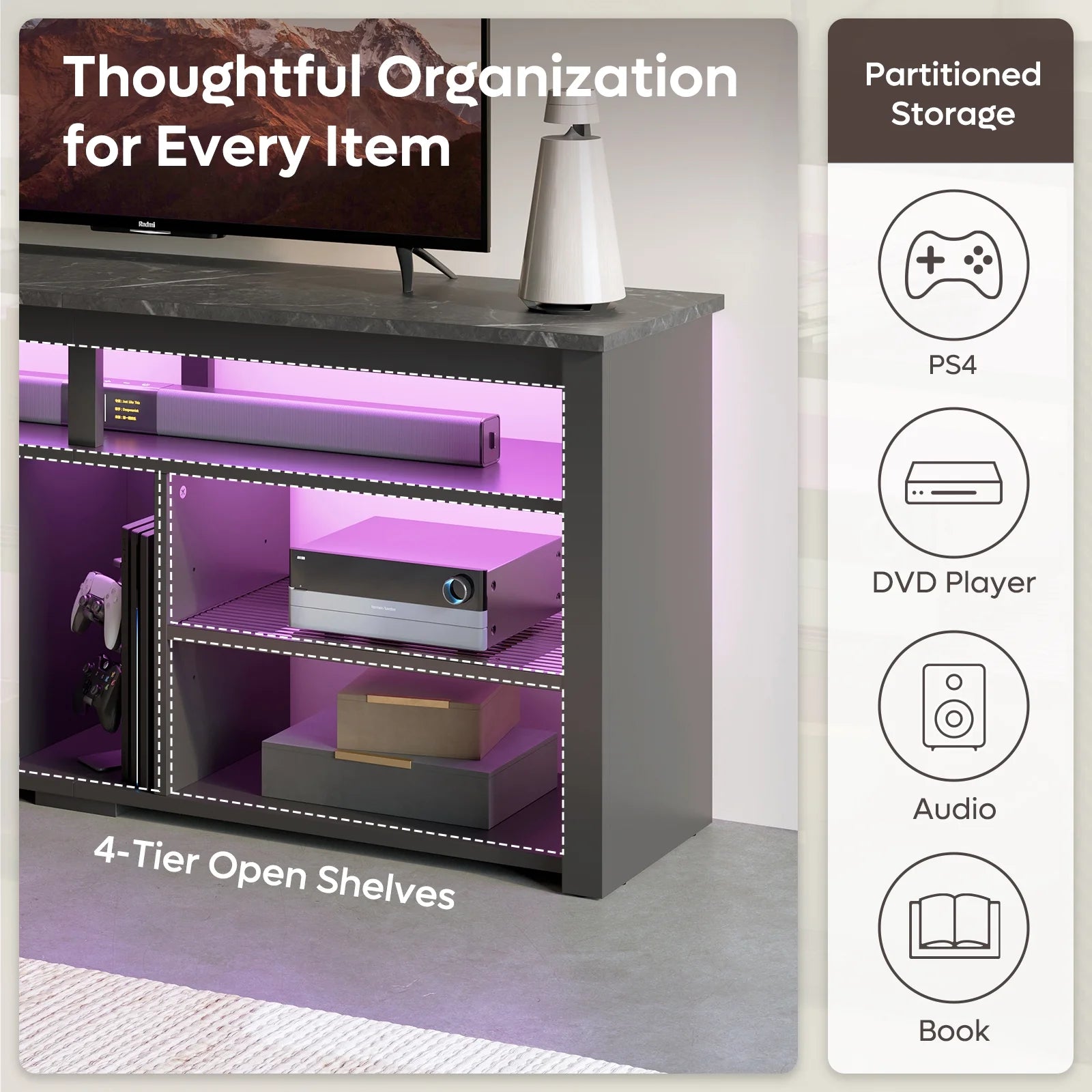 Gaming Entertainment Center with Storage: . Featuring open storage space and adjustable shelves to cater to your diverse storage needs. With a multi-compartment design, it facilitates organized storage for neatly accommodating TV boxes, media devices, DVDs, remotes, and gaming consoles. The discreet cord holes at the back ensure a tidy appearance by seamlessly managing wires.